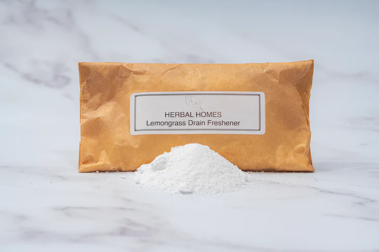 Herbal Homes Drain Freshener powder with Lemongrass essential oils. Lemongrass is antibacterial, an insect repellent and leaves a wonderful scent. Help to remove built up scum and grim to keep drains fresh.