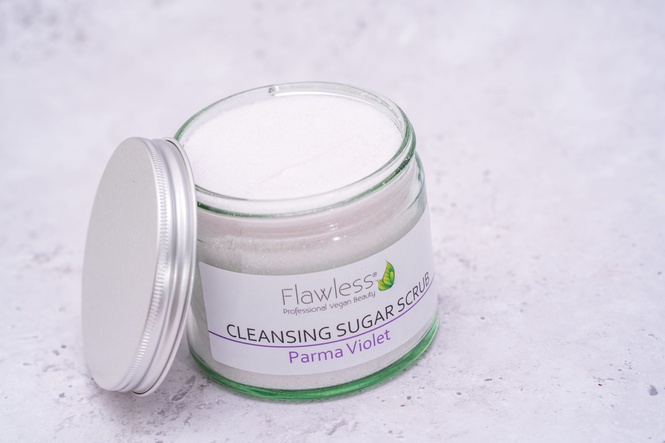 Product packaging: Our Sugar Scrub comes in recycled glass jar with aluminium lid. 250g
